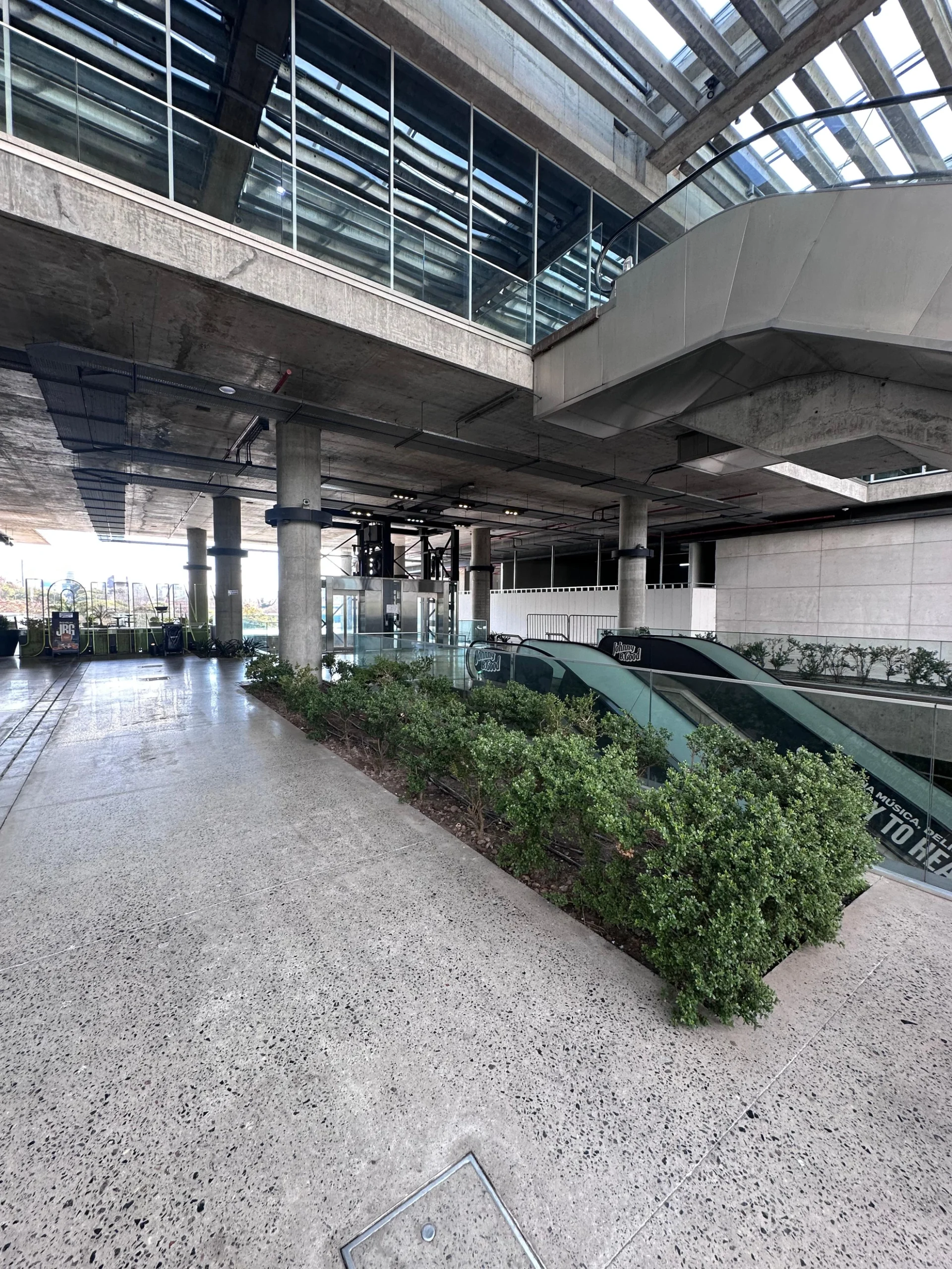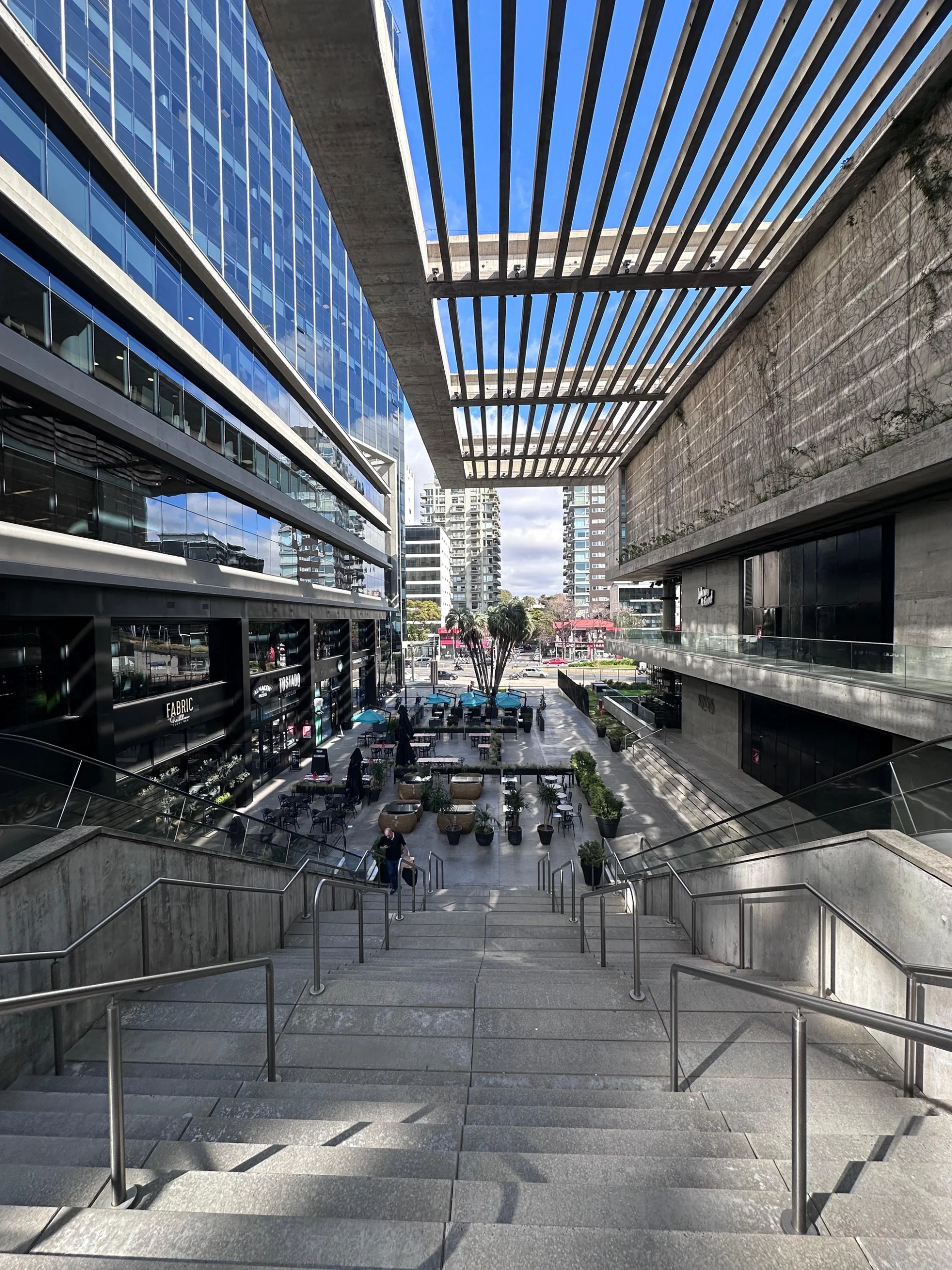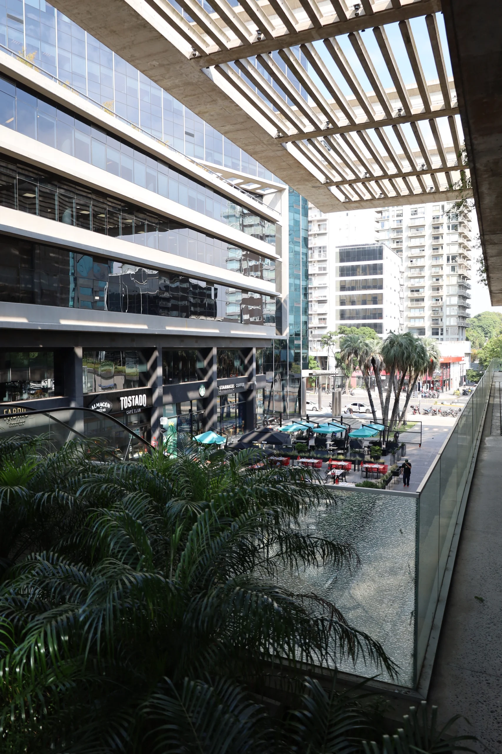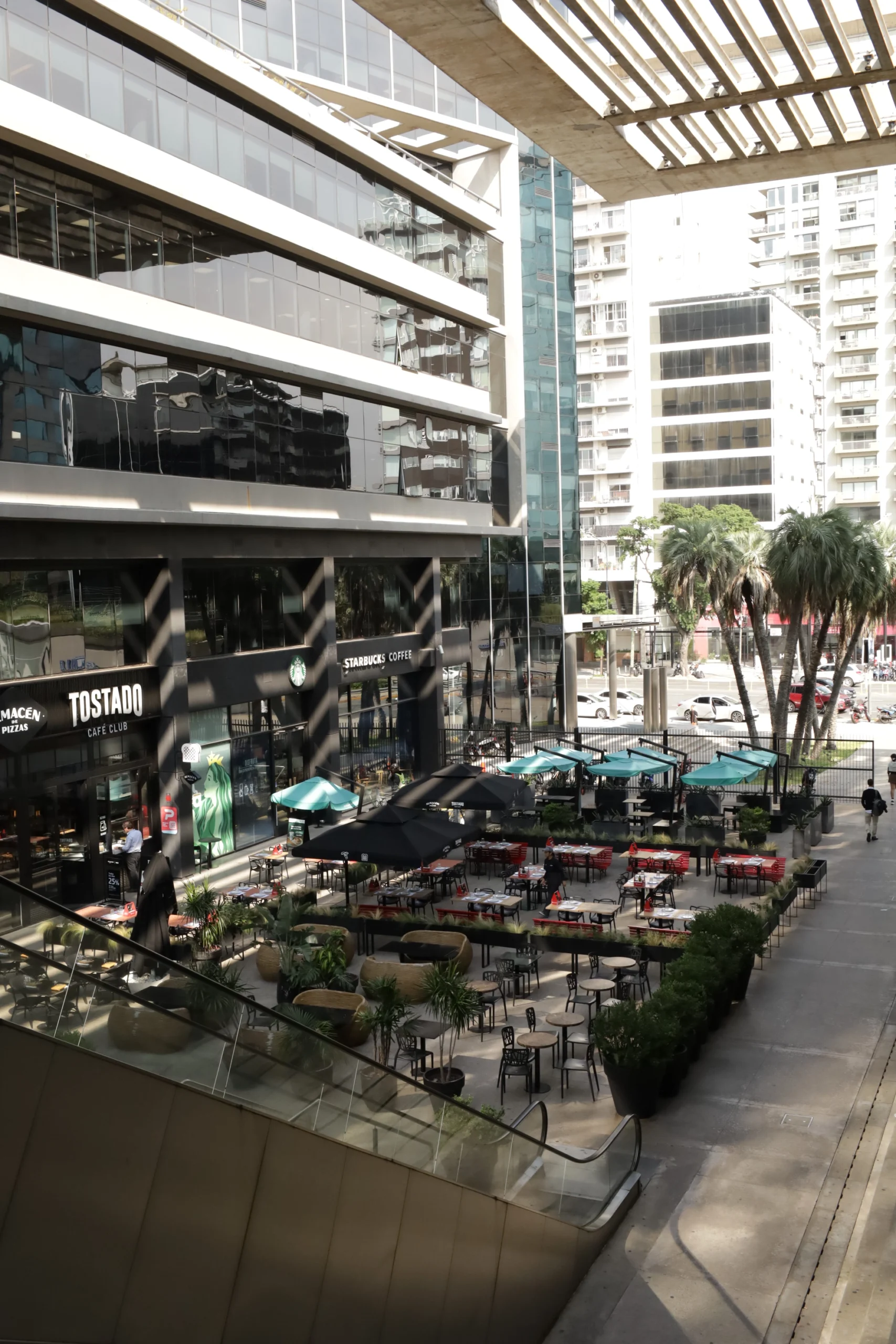 Sectores al aire libre integrados al entorno comercial y corporativo, diseñados para el descanso y la circulación.